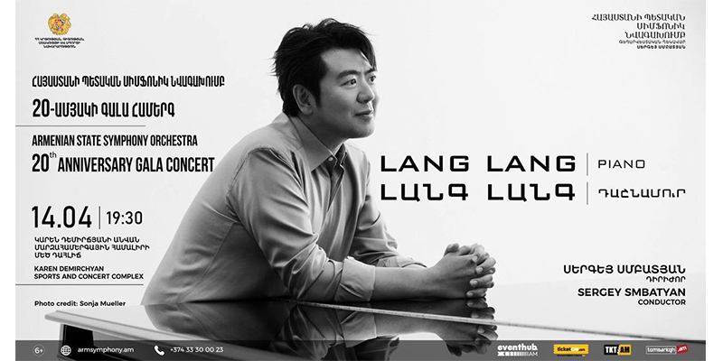 ՀՀ կրթության, գիտության, մշակույթի և սպորտի նախարարության ֆինանսավորմամբ և աջակցությամբ ապրիլի 14-ին Կարեն Դեմիրճյանի անվան մարզահամերգային համալիրի մեծ դահլիճում տեղի կունենա Հայաստանի պետական սիմֆոնիկ նվագախմբի 20-ամյակին նվիրված գալա համերգը, որի հատուկ հյուրը կլինի աշխարհահռչակ դաշնակահար Լանգ Լանգը։