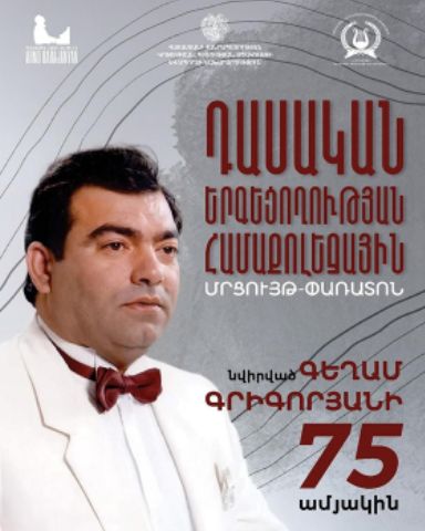 ՀՀ կրթության, գիտության, մշակույթի և սպորտի նախարարության աջակցությամբ Երևանի Առնո Բաբաջանյանի անվան պետական երաժշտամանկավարժական քոլեջի և «Արտպրոգրես» մշակութային ՀԿ նախաձեռնությամբ մարտի 21-22-ը կանցկացվի դասական երգեցողության համաքոլեջային մրցույթ-փառատոն՝ նվիրված ՀԽՍՀ ժողովրդական արտիստ, անվանի օպերային երգիչ(տենոր) և բեմադրիչ Գեղամ Գրիգորյանի ծննդյան 75-ամյակին:
