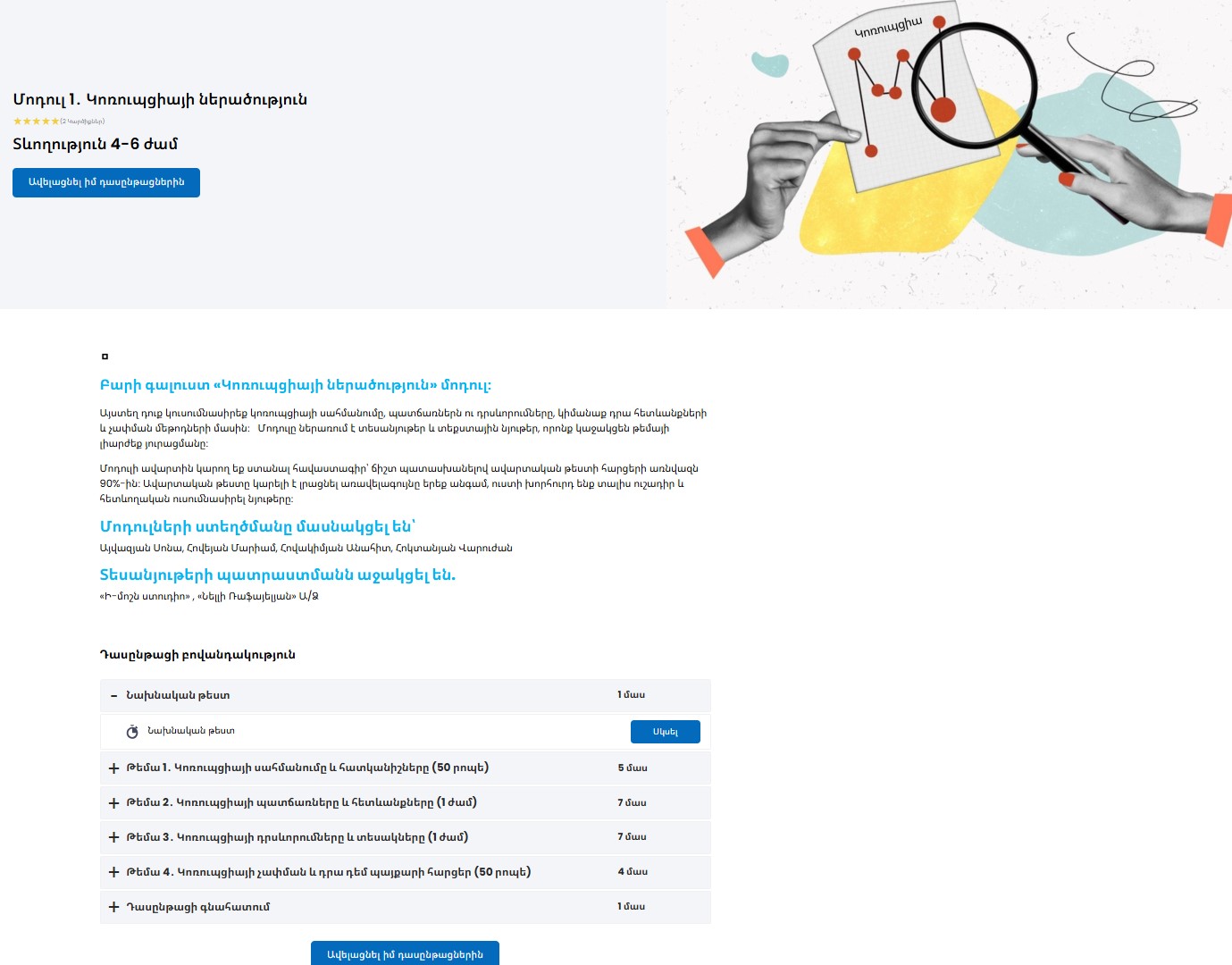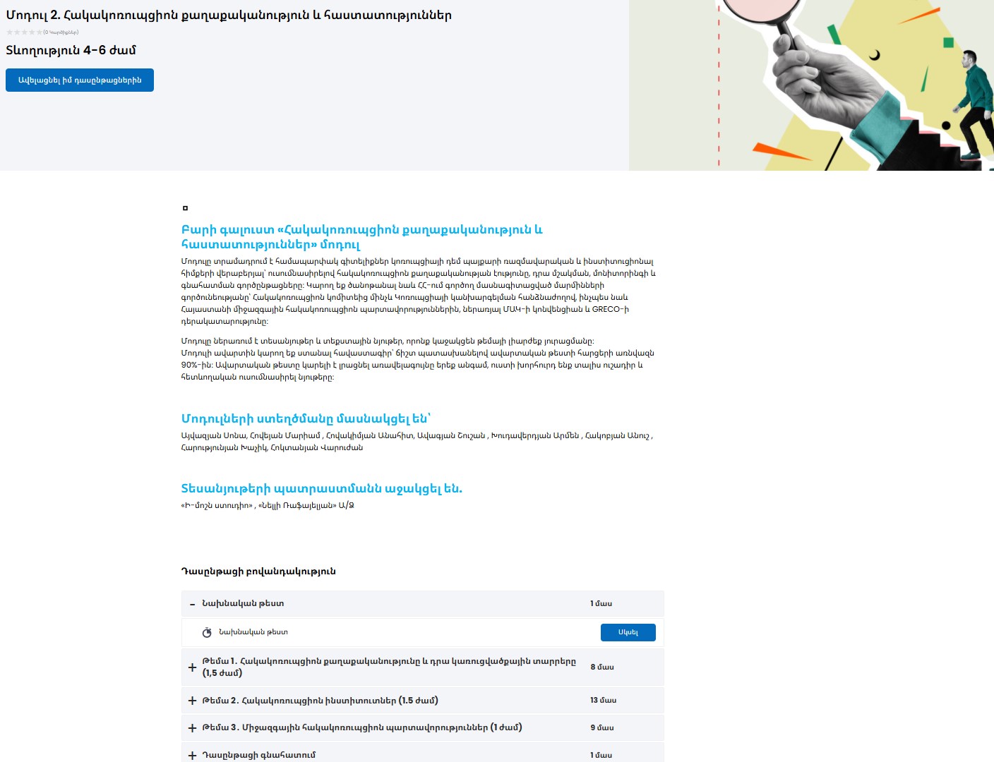 Մոդուլները նախատեսված են ուսանողների, հանրային ծառայողների, ուսուցիչների, լրագրողների, հասարակական կազմակերպությունների ներկայացուցիչների և բոլոր այն մասնագետների համար, ովքեր ցանկանում են համապարփակ գիտելիք ստանալ հակակոռուպցիոն ոլորտի մասին։ Մեր մոդուլները ներառում են տեսադասեր, տեքստային և անիմացիոն նյութեր, իսկ թեմատիկ թեստերը նպաստում են ձեռք բերված գիտելիքների ամրապնդմանը։