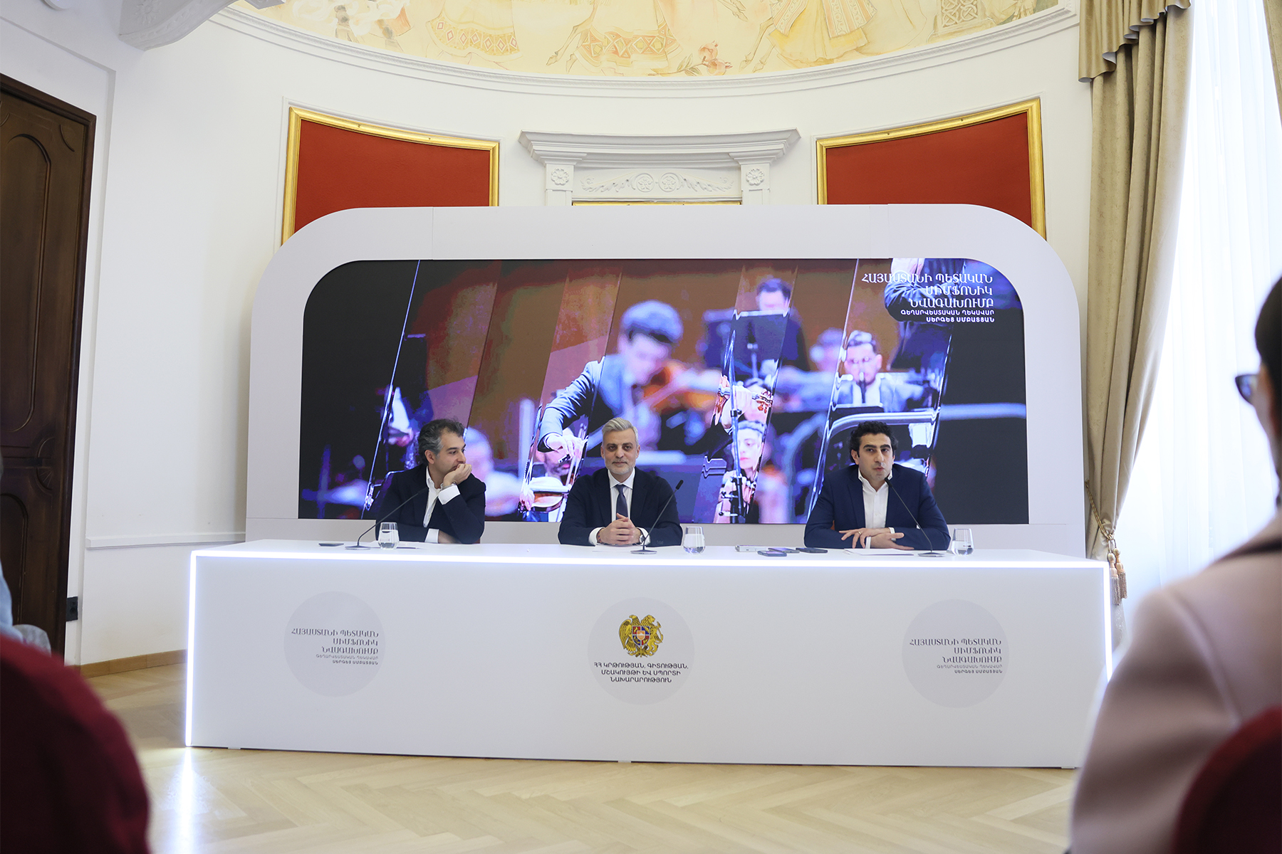 Բանախոսներն էին ԿԳՄՍ նախարարի տեղակալ Դանիել Դանիելյանը, Հայաստանի պետական սիմֆոնիկ նվագախմբի գեղարվեստական ղեկավար և գլխավոր դիրիժոր Սերգեյ Սմբատյանը, նվագախմբի տնօրեն Սարգիս Բալբաբյանը։